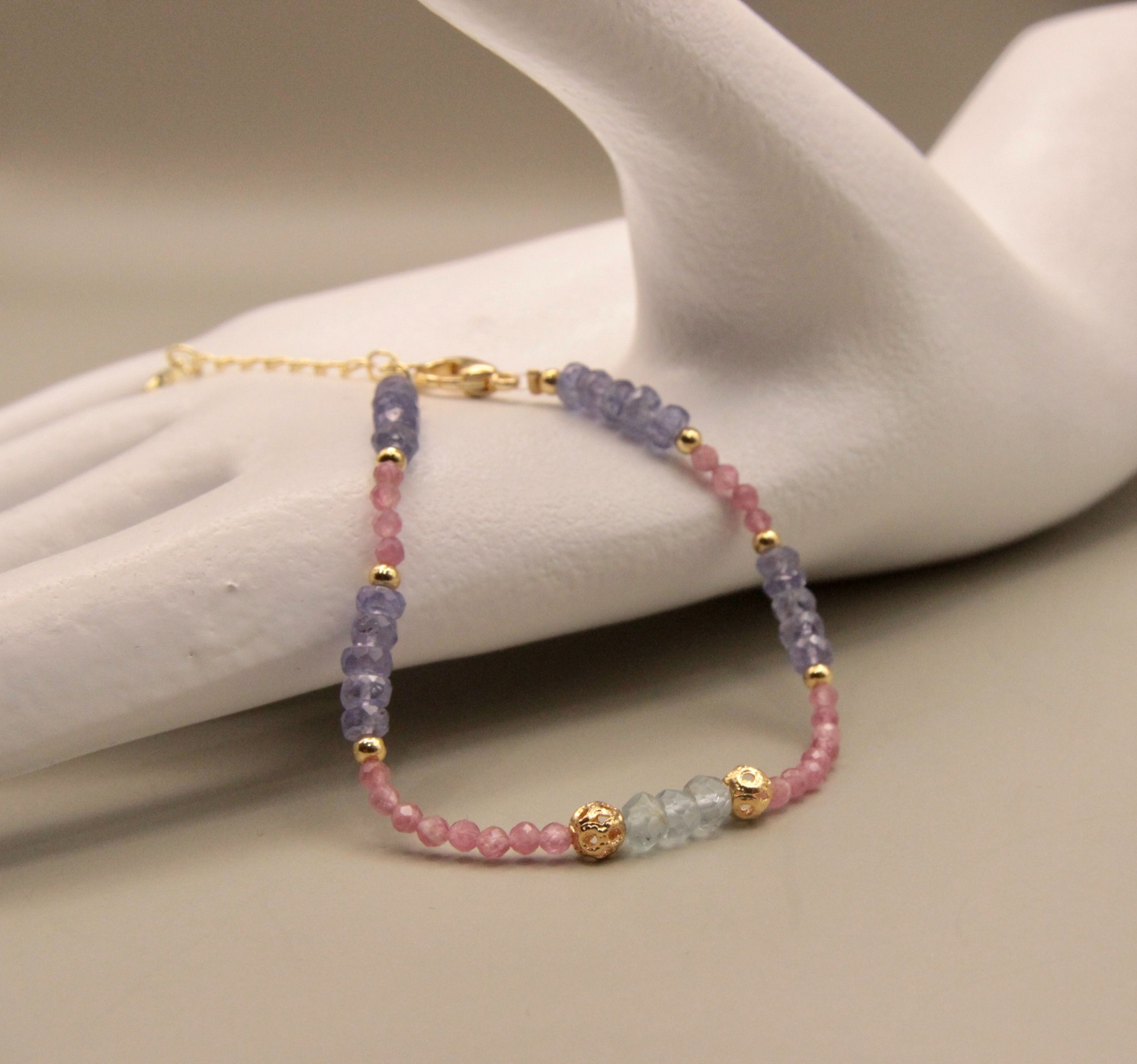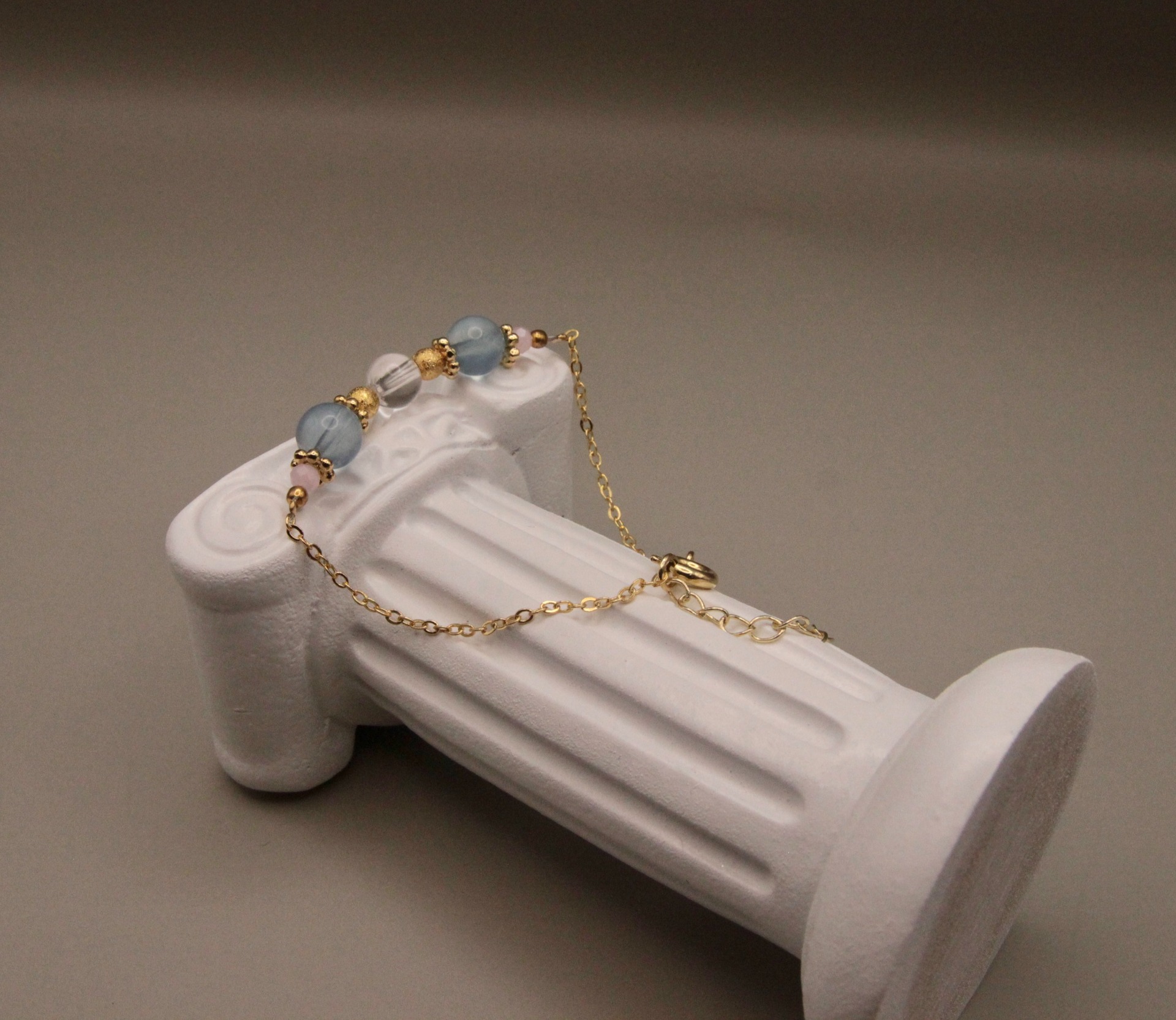 『淡藍之境』海藍寶 粉晶 ,天然無處理水晶,14K銅注金手鍊,設計款文創手作|元元圓滾滾滾