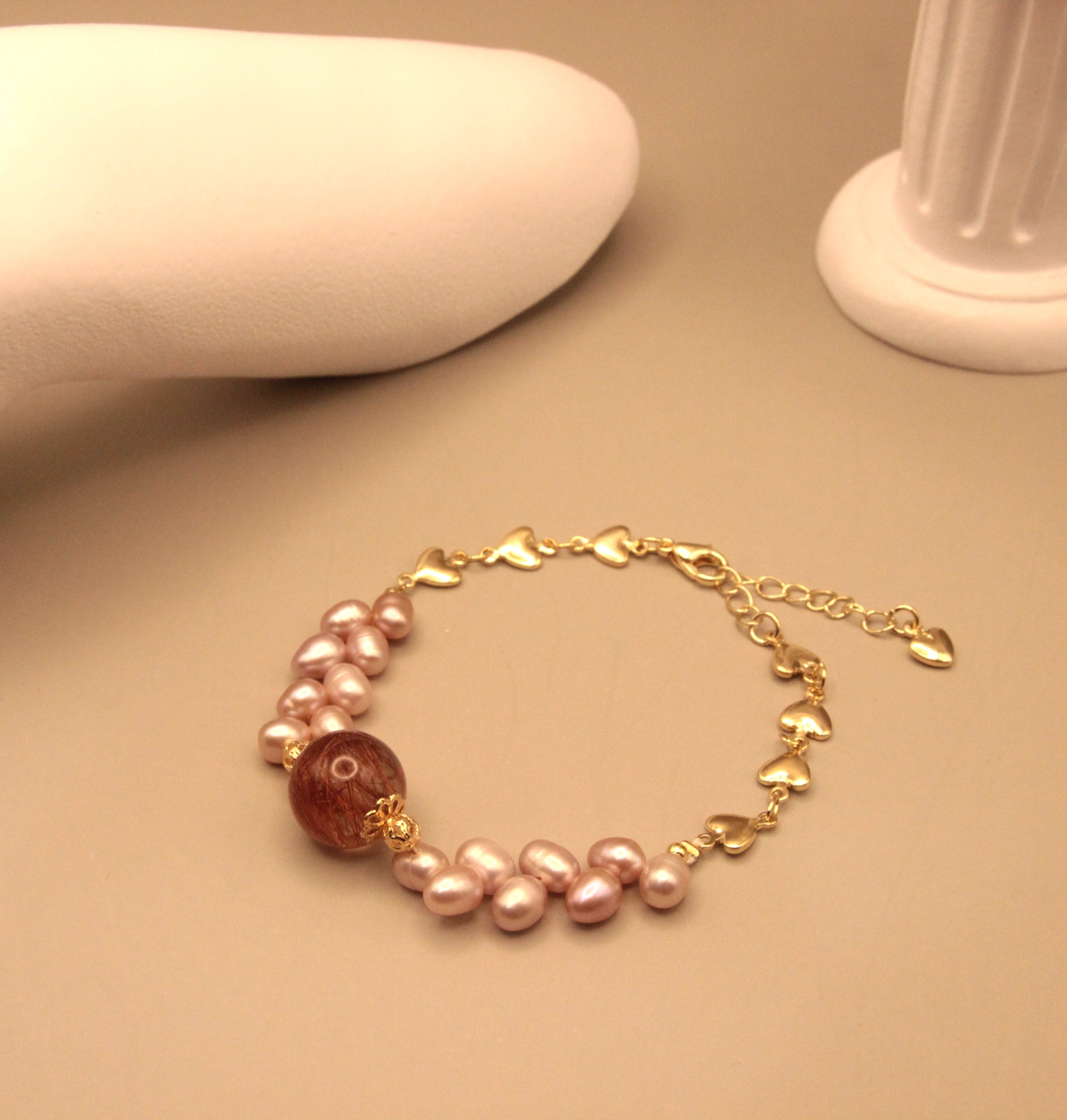 『胭脂迴』紅草莓晶+櫻花瑪瑙,天然無處理水晶,14K銅注金手鍊,設計款文創手作|元元圓滾滾