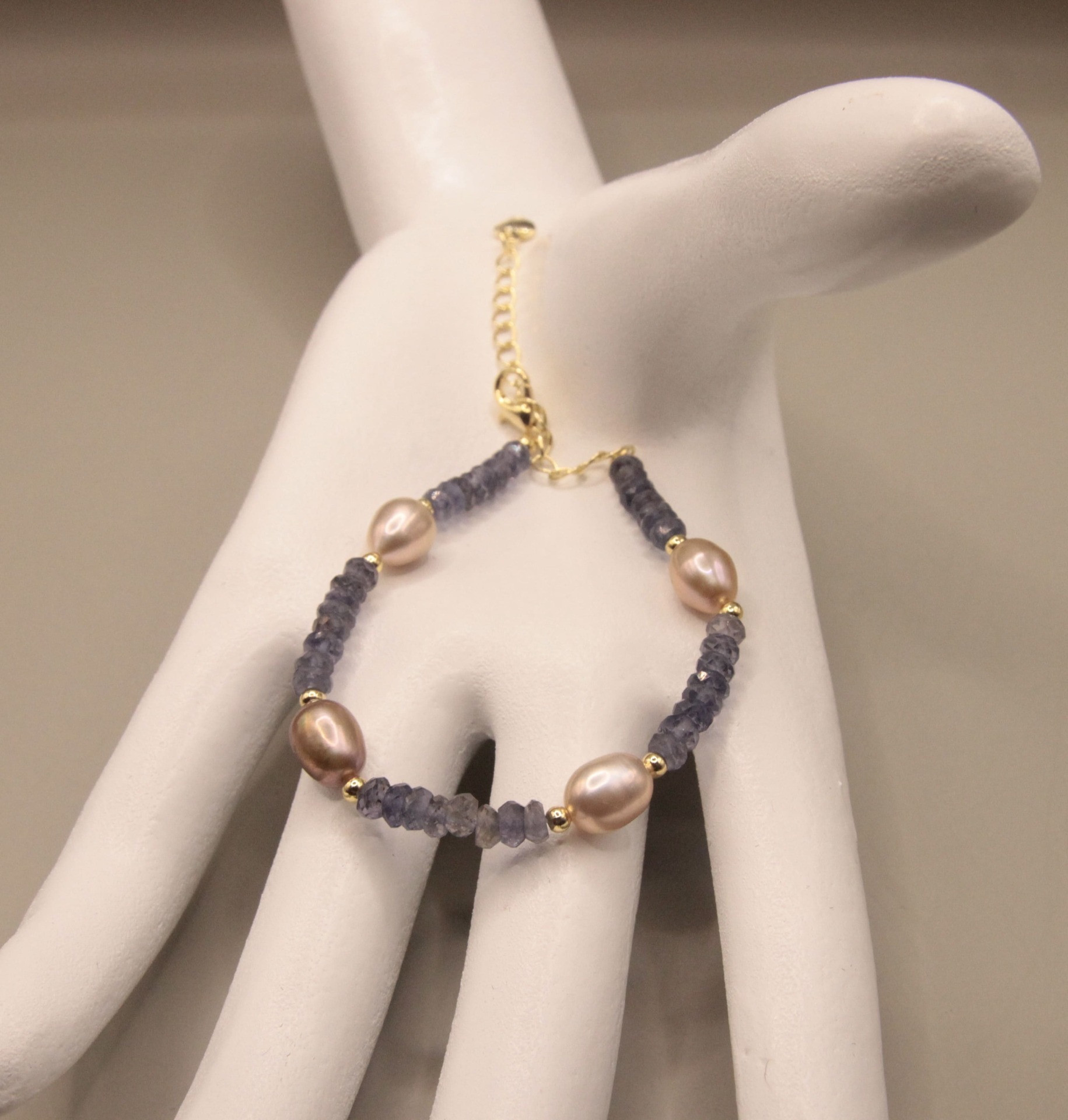 『海洋之星』天然珍珠+菫青石,天然水晶,14K銅注金手鍊,設計款文創手作|元元圓滾滾
