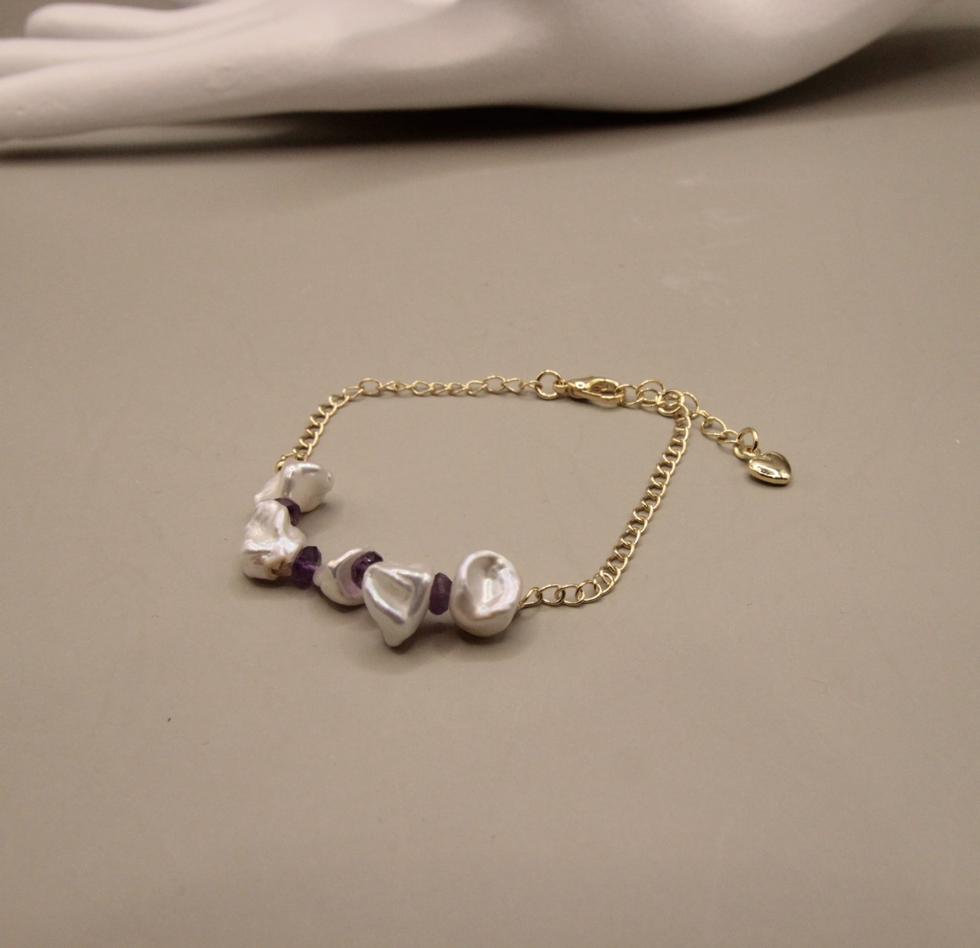 『回首』天然珍珠 紫水晶 紫幽靈水晶,天然無處理水晶,14K銅注金手鍊,設計款文創手作|元元圓滾滾