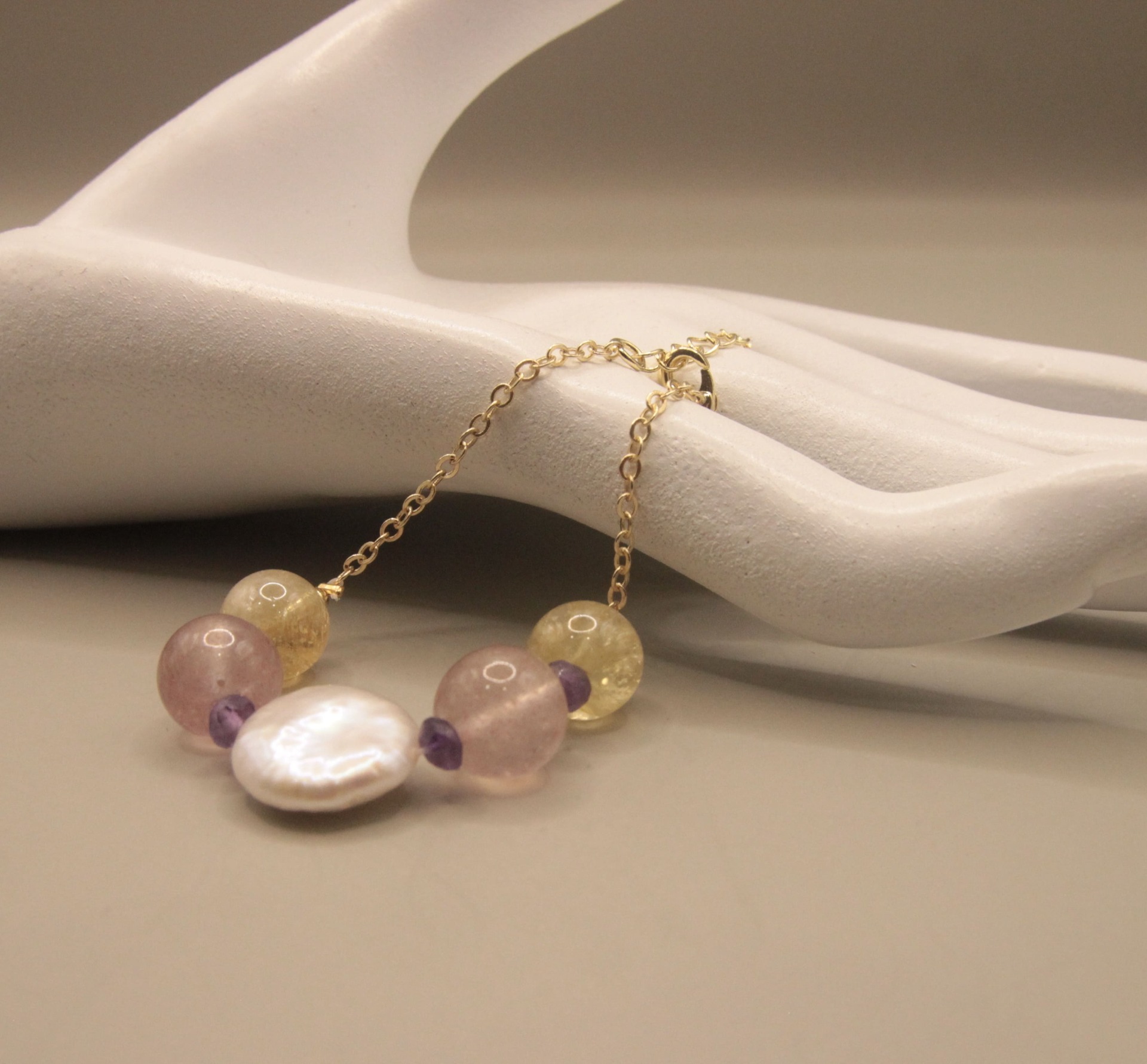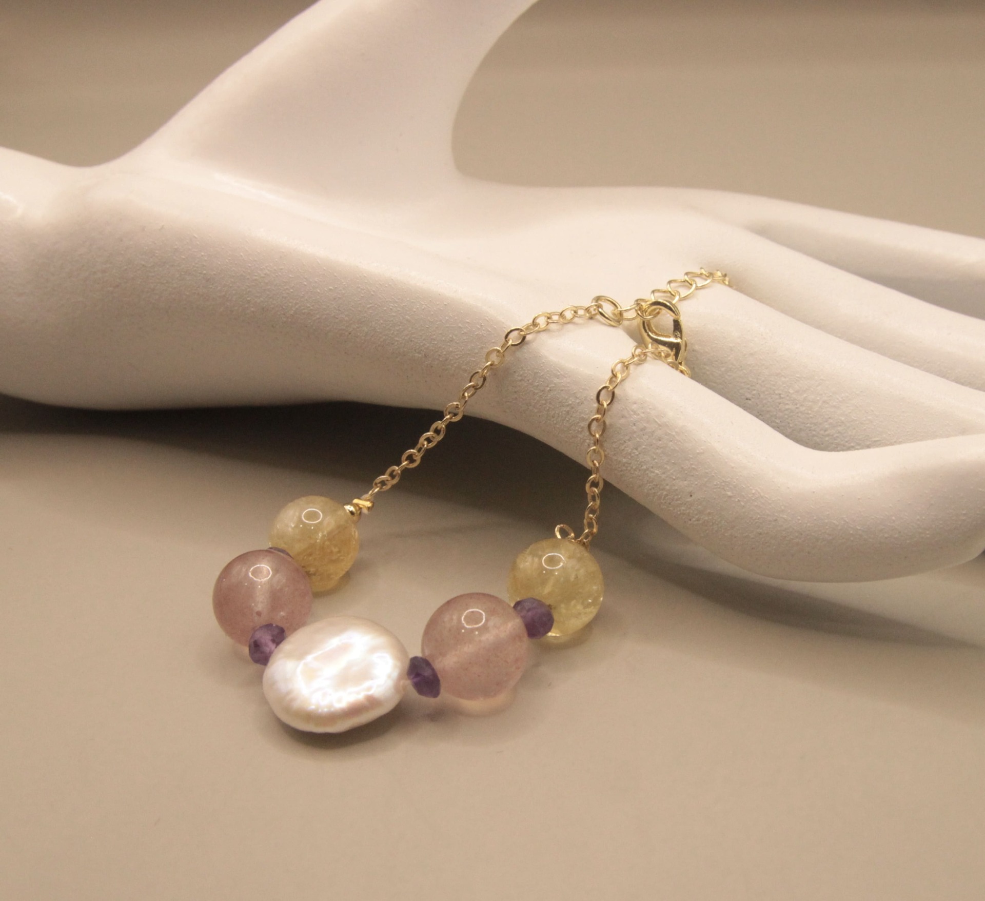 『回盼』天然珍珠+黃水晶+紅草莓晶,天然無處理水晶,14K銅注金手鍊,設計款文創手作|元元圓滾滾
