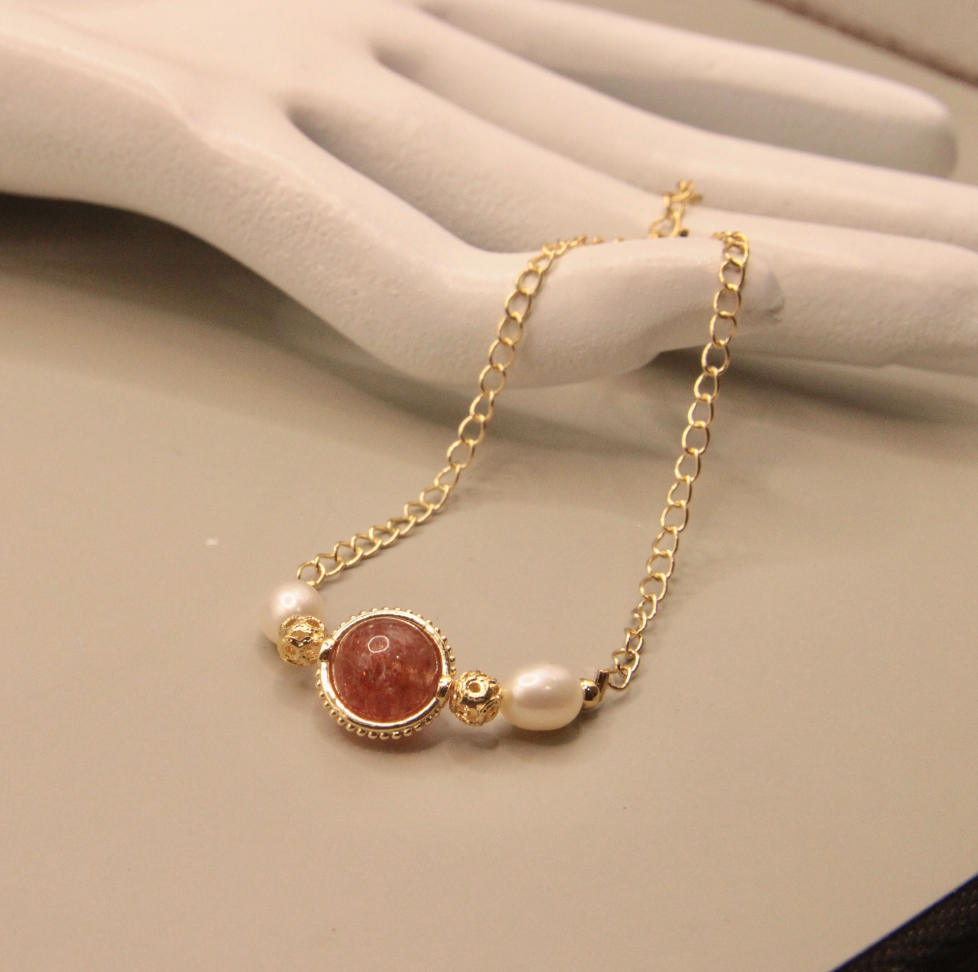 『火神之淚』太陽石+天然珍珠,14K銅注金手鍊,設計款文創手作|元元圓滾滾