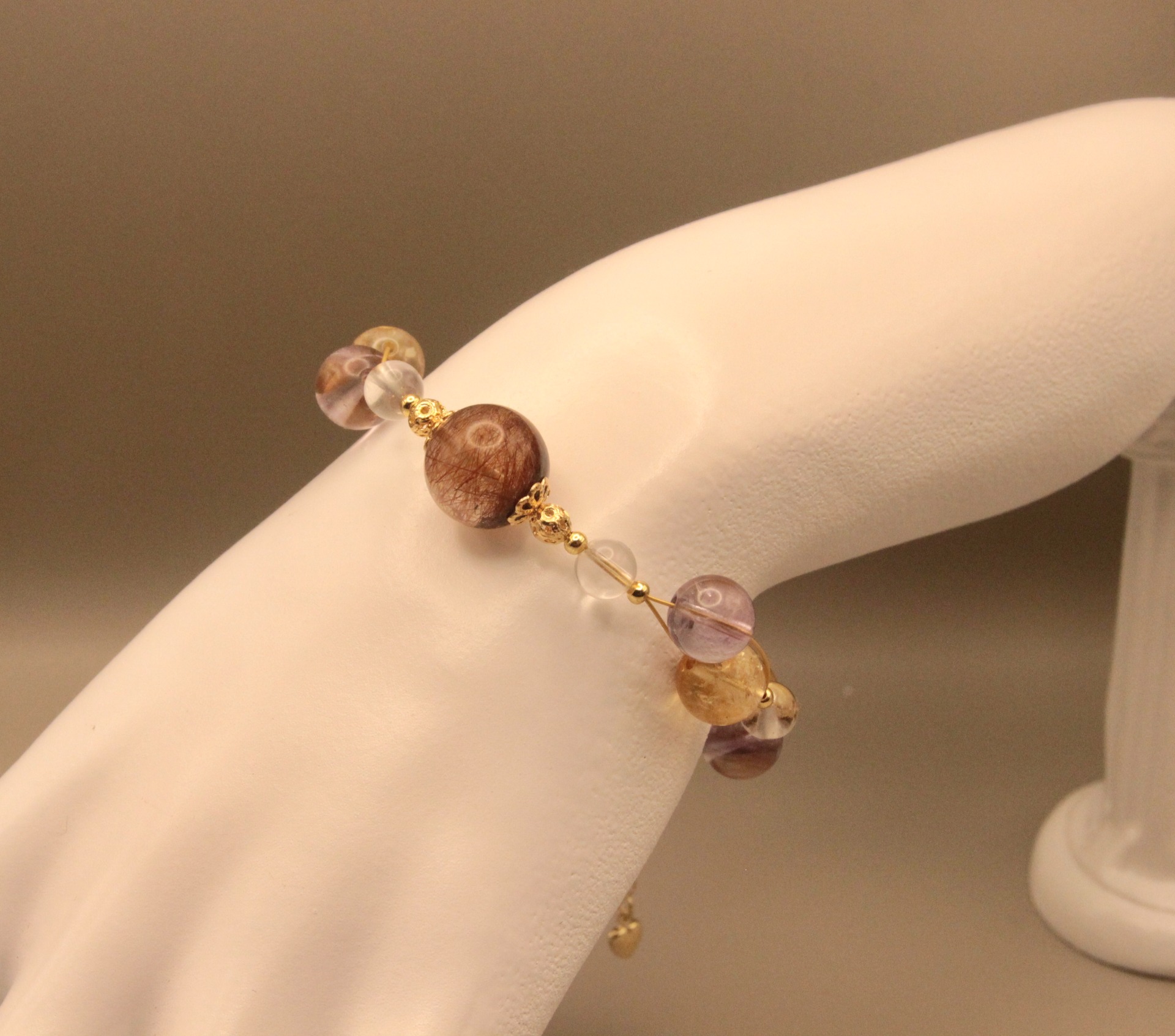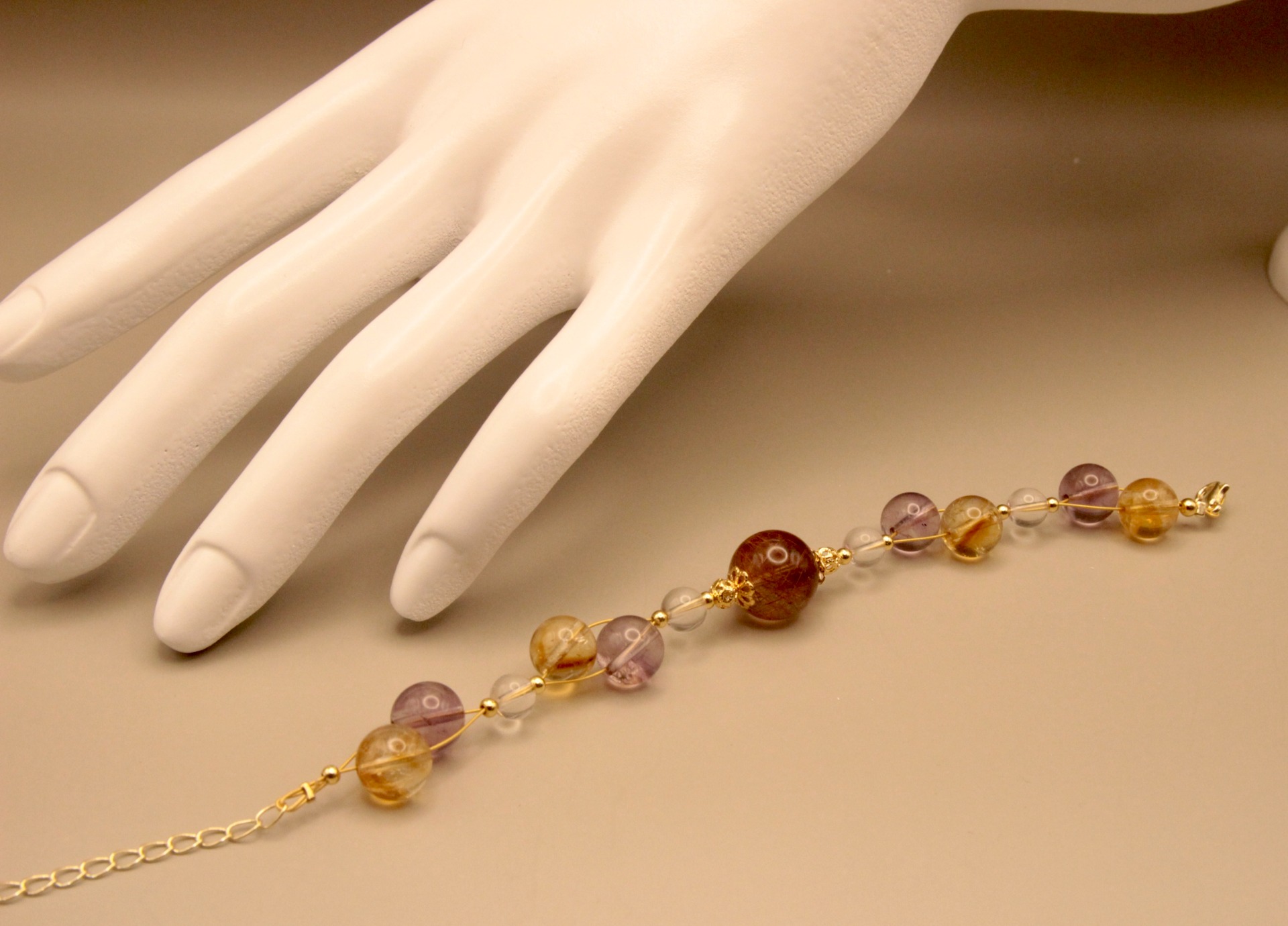 寶石:紅銅鈦+紫水晶+黃水晶材質:14K銅注金手鍊